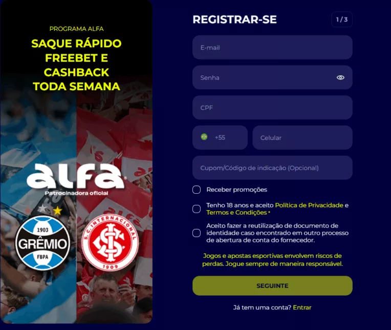 Criar uma conta na Alfabet é simples e rápido. Basta acessar o site oficial, clicar em “REGISTRE-SE” e preencher um formulário com informações básicas, como e-mail, CPF e celular, além de criar uma senha segura.