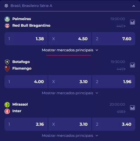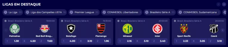 O site e o aplicativo são intuitivos, especialmente se você já utiliza outros sites de apostas. A navegação, contudo, por vezes pode parecer um pouquinho lenta, mas nada que atrapalhe tanto o usuário. Um recurso bacana está na possibilidade de ver os principais mercados dentro da tela de uma liga, conforme imagem abaixo.
